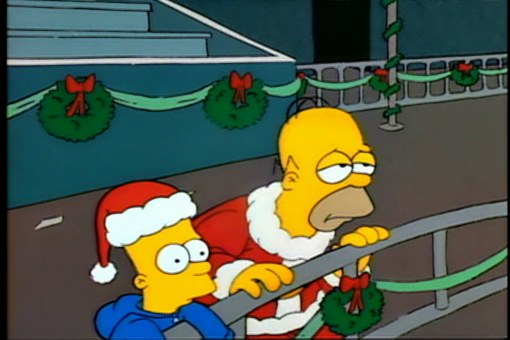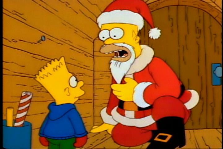 The song concludes with the elves getting their drink on celebrating their adequate gorillas. Bender takes flight and passes by the moon before circling the area and dropping gifts that explode like fireworks. Poor Robot Santa can only issue threats from his icy prison. Bender arrives on Earth and encounters his first home. The chimney has a grate across it which Bender bends easily before entering. Upon landing in the fireplace, he comes face to face with a mother and her kids. She (MacNeille) declares that this is the end and frantically instructs her children to take their suicide pills. Bender stops her telling her he’s the good Santa and he comes baring gifts – at reasonable prices! This is when the father (Herman) pops his head up telling his kids not to believe Santa for he is the father of all lies and the uncle of all tricks. Not even Bender producing a box of Tri-Ominos can sway them and he’s forced to bail. As he does, the entire family wails on his legs with fireplace tools. Bender is able to escape though quite the worse for ware.