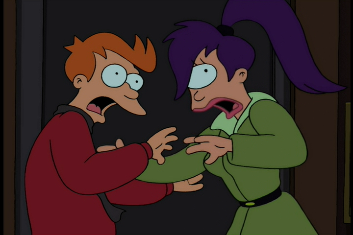 At Planet Express HQ, fire is raging all around while the crew is huddled in the darkened living room. Leela is miserable because all of the trouble they went through just lead to an Xmas just as horrible as before. Then it dawns on Fry that this terrible future version of Xmas still does retain some of the magic of the one he left behind for it’s fear that has brought them together. The Professor is ready to tell him how stupid he thinks that sentiment is, then an explosion goes off and he meekly requests, “Hold me!” The whole crew are then left embracing each other in terror on the sofa as somber music plays.