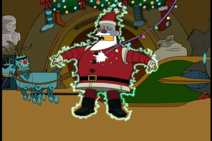 Santa is interrupted by the elves delivering the sack of letters. Santa is angry they failed to knock reminding them he could have been watching something really naughty on his device (“I get New Orleans on this thing!”). The elves, clearly terrified, apologize and run off before Santa can say anything else. Inside the letter sack, Leela informs the others of her plan to confuse Santa with a logical paradox and issues a warning to Bender. The three emerge from the sack and Santa is understandably surprised. He whips out a very large gun preparing to blow them away, but surprisingly responds in kind when Leela asks him to stop. He listens as she introduces her paradox (while Bender covers his ears and hops up and down) which claims that Santa is designed to punish the naughty, but is too naughty, and therefore he should have to destroy himself. The robot’s head begins to smoke and spin before finally exploding. Wow, that was easy. Why didn’t anyone think of that before?