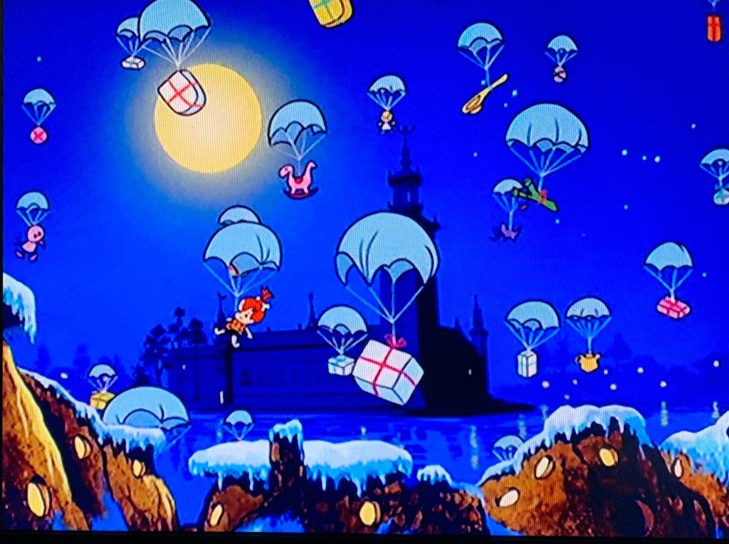 It’s now time for a montage! Clearly, if we were to follow Fred and Barney to every house this thing would last way longer than 48 minutes so instead we just see them fly past obvious, global, landmarks while presents rain down from the sky. It’s set to the main theme of the special in an instrumental fashion, but soon some lyrics come in. “Sounds of Christmas Day” is performed as we see kids receive their presents which fall from the sky. They celebrate Christmas by ice skating, sledding, and doing what kids love to do most on Christmas Day – open presents!