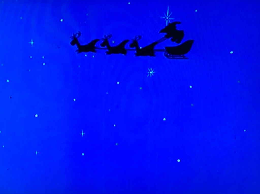 Wilma thanks Fred, and he apparently learned something tonight to not take credit for other people’s work (like he did with Barney all night) and tells Wilma she should really be thanking Santa. The kids then start calling out that they see Santa flying in the sky from the window. Wilma and Betty have a giggle at the imaginations of children while Fred and Barney race over to the window and start waving bye themselves. The women seem stunned a moment, but then laugh again. Wilma remarks that they certainly have the Christmas Spirit and Fred and Barney confirm to her that they sure do. We cut to the sky and are treated to a moon shot as Santa flies by. It’s he who gets the customary last line as he calls out “Merry Christmas to all!” and we close on a shot of Bedrock from sky level.
