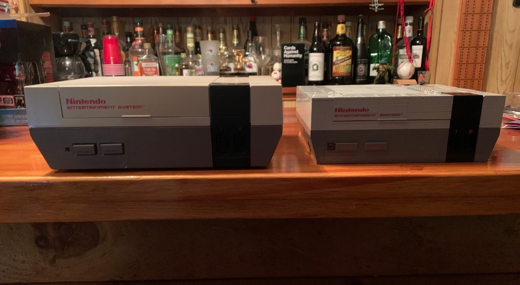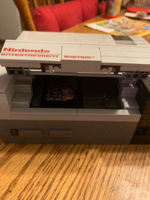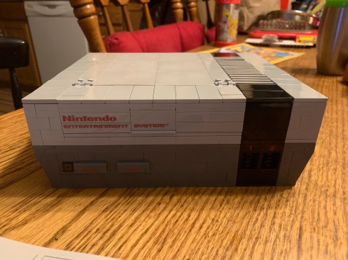 The finished product is smaller than the real thing, but not by that much. I had the original NES, in terms of width, height, and depth as: 10.125″ x 3.5″ x 8″. The Lego version measures out as: 8.125″ x 3″ x 7″. The controller is more 1:1 though the Lego one is a touch thinner. It also isn’t a perfect rectangle as the sides and bottom don’t line up perfectly which is perplexing. I guess they didn’t want to engineer a slightly longer, flat, piece? I don’t know why they couldn’t use existing pieces to get it so that it didn’t have such a gap. It’s minor though, but something that I notice. There are also no working buttons on this thing. They look the part, but don’t function, which I expected but it would have been fun if the A and B buttons on the controller at least were able to be pressed.