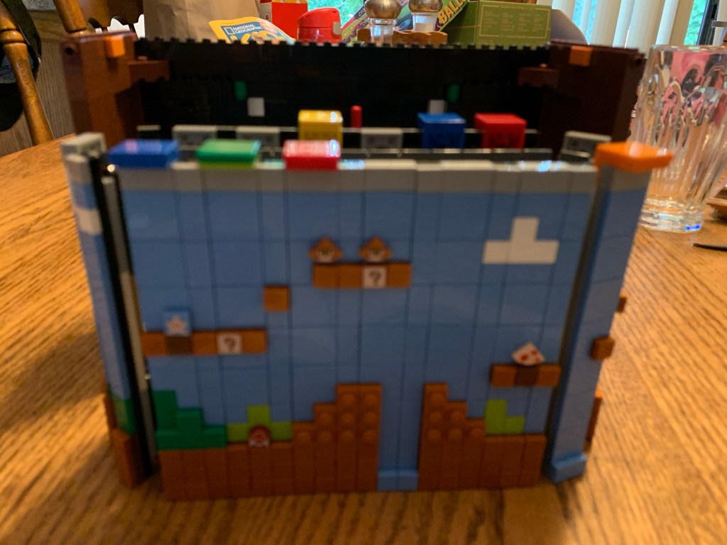 With the set complete, you’re free to experience what it offers. Turning the crank makes the scenery move and Mario will just slide over it. This means he has only one path and you don’t want to try and force him to go higher than intended or else you risk jamming the mechanism. My son did this as he wanted Mario to stomp more goombas and got it stuck. I had to pop Mario off and some of the other pieces to get it going again. I didn’t have to resort to this, but in hindsight it’s nice Lego includes extra tiles for goombas, turtle shells, etc. in the event one were to pop off and fall into the TV it could just be replaced rather than disassembled to dig out one little tile. It works as advertised though and my kids though it was pretty fun.