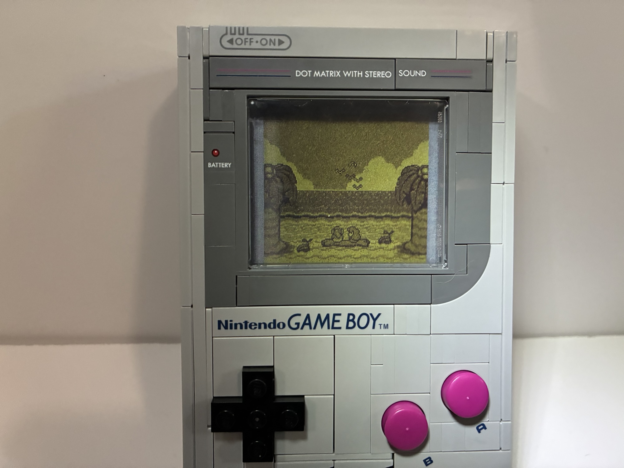 For the presentation, Lego opted to forego stickers entirely for the Game Boy. All of the graphics you see in the pictures are printed onto actual bricks including the vent on the front and the “battery compartment” on the rear of the system. It’s definitely appreciated, especially for something people will want to hold. Lego also prioritized making the Game Boy have a tactile presence as well. The directional pad is only partly held down by bricks and is floating atop some rubber pieces so it actually pushed in when pressed. The Start and Select buttons are Lego, rubber, tires and the A and B buttons have some depth to them as well. For the volume and contrast, a Lego gear was inserted. It looks the part, and provides more immersion. Even the on-off switch was done with a sliding piece that really clicks into place.