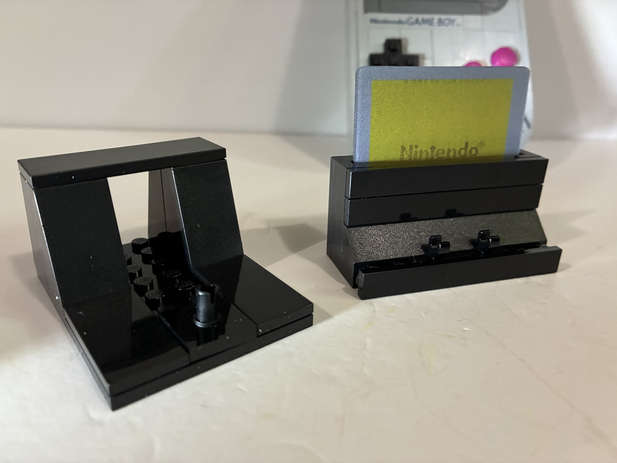 In addition to the buttons, the play feature here is the screen. Lego included three lenticular screens to swap in and out of the system. The basic one is the Game Boy start-up screen which simply reads Nintendo. In addition to that, there’s a screen for each game if you want to get specific. For Super Mario Land, it’s Super Mario bouncing into a question mark block. For Zelda, you get an image from one of the “cinematic” moments in the game of Link and a girl (I forget who this girl is, I don’t think it’s Zelda) seated on a log. The games are easy to remove and insert as is the screen. You do have to pop the “battery compartment” off to access the screen, but it’s not particularly cumbersome or tricky. The stands are a very basic construction using all black pieces. The Game Boy one is a bit sturdier and seems to work just fine. The game stand includes a slot for the unused screens and Lego assumes you will always have one game in the system at all times.