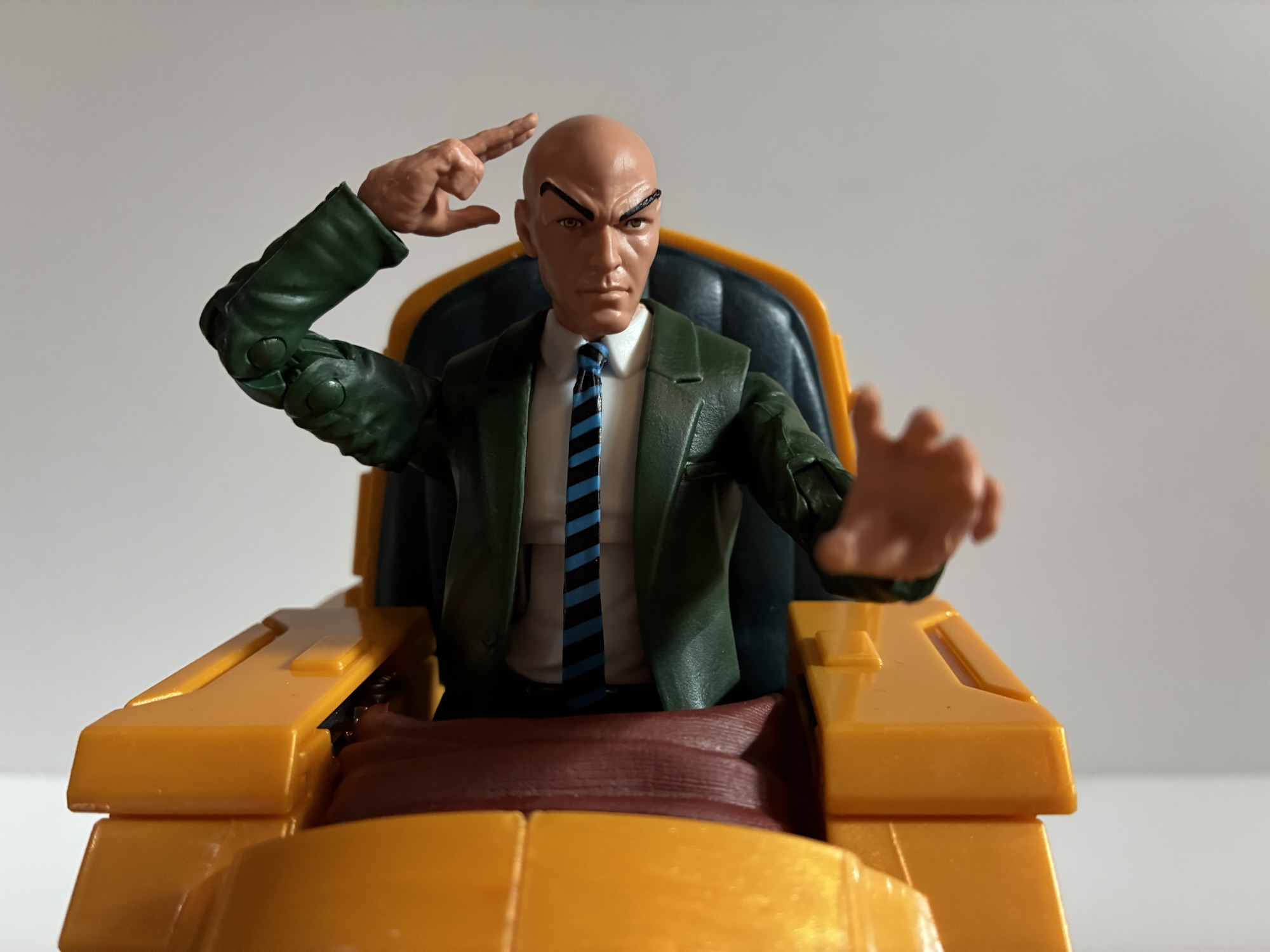 When I buy one version of a character that I’m not crazy about I hate to compound the issue by buying another version of the same character. Especially when I don’t love that other version either. And with this Xavier it’s the face I don’t love. Xavier is often illustrated with pronounced cheek bones, but in three dimensions that makes for a bit of a lumpy appearance. Hasbro has also introduced more detailed face printing in recent years and sometimes they overdo it. That strikes me as the case here with Chuck as his eyes are rimmed with black and his lips are painted. The shade is almost like a slightly metallic peach and doesn’t look like a natural lip shade to me. It actually reminds me of a shade of lipstick my grandmother used to wear. I feel like he’s a wig away from being able to cosplay as a Golden Girl. This is in contrast to what I would want him to look like which is the animated series which took a very plain look to its character designs with mostly smooth features and no shading for the lips.