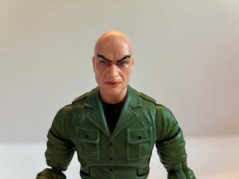 Basically what I’m saying is that, apart from the bald head and the pronounced eyebrows, this portrait doesn’t scream Xavier to me. As for the rest of the sculpt – it’s fine. I think this body is reused from a past release, but I can’t be certain. The legs may be from Wonder Man though I’m not sure about the arms and torso. I don’t have enough Legends figures to know. Whether they are or are not, it doesn’t matter so long as they work for this figure and in this case I would say that they do. Most of the figure is colored plastic with paint reserved for the black undershirt and the belt. There are some black buttons painted onto the shirt and the rolled up sleeves were painted a lighter shade of green from the rest which is a nice touch. And we get some X logos printed on the shoulders. The greens are mostly consistent, but the legs and arms appear to have a touch more yellow to them than the torso. The knees and elbows are also a little off which is typical of these pin-less joints from Hasbro. This figure is not the worst offender in that regard and the difference is pretty subtle.
