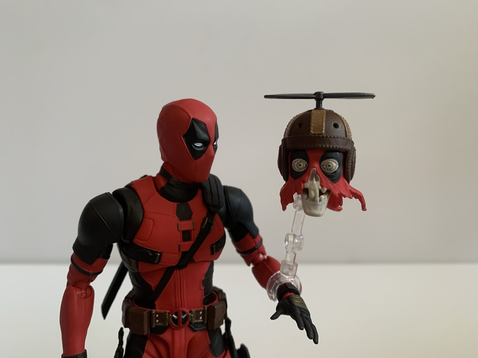 That’s not everything though, as Deadpool has one other accessory of note: Headpool. Headpool is the decapitated and decrepit remains of a Deadpool from an alternate universe. He has this old school leather pilot’s helmet with a propeller on top that allows him to basically float around. What’s left of his mask just dangles in tatters while his exposed skull is free to yammer away, despite no longer having a voice box. He’s basically a visual joke in the movie that Bandai brought to life. The head is well sculpted and painted and the little propeller does rotate, but that’s it for articulation. I’m surprised the jaw doesn’t move. Also included is a clear, acrylic, post that plugs into the head at one end and features a c-clamp on the other. It’s designed to clip onto Deadpool’s forearm, which works well enough, but I wish it had an optional platform to just stick him on the shelf beside Deadpool or a way to plug into Deadpool’s back so that he’s hovering over his shoulder. With the setup provided, he’s really only useful in one pose and I don’t know how many collectors will want to clip this guy onto Deadpool’s arm? I definitely don’t so it feels like a wasted accessory.