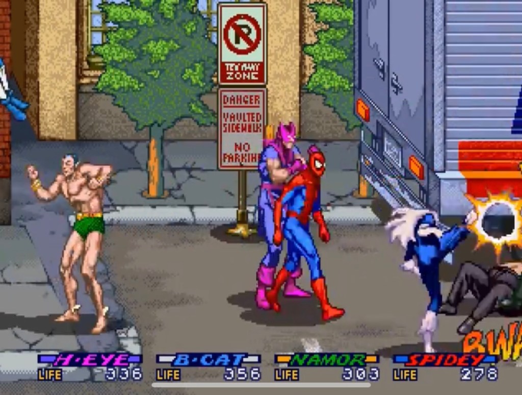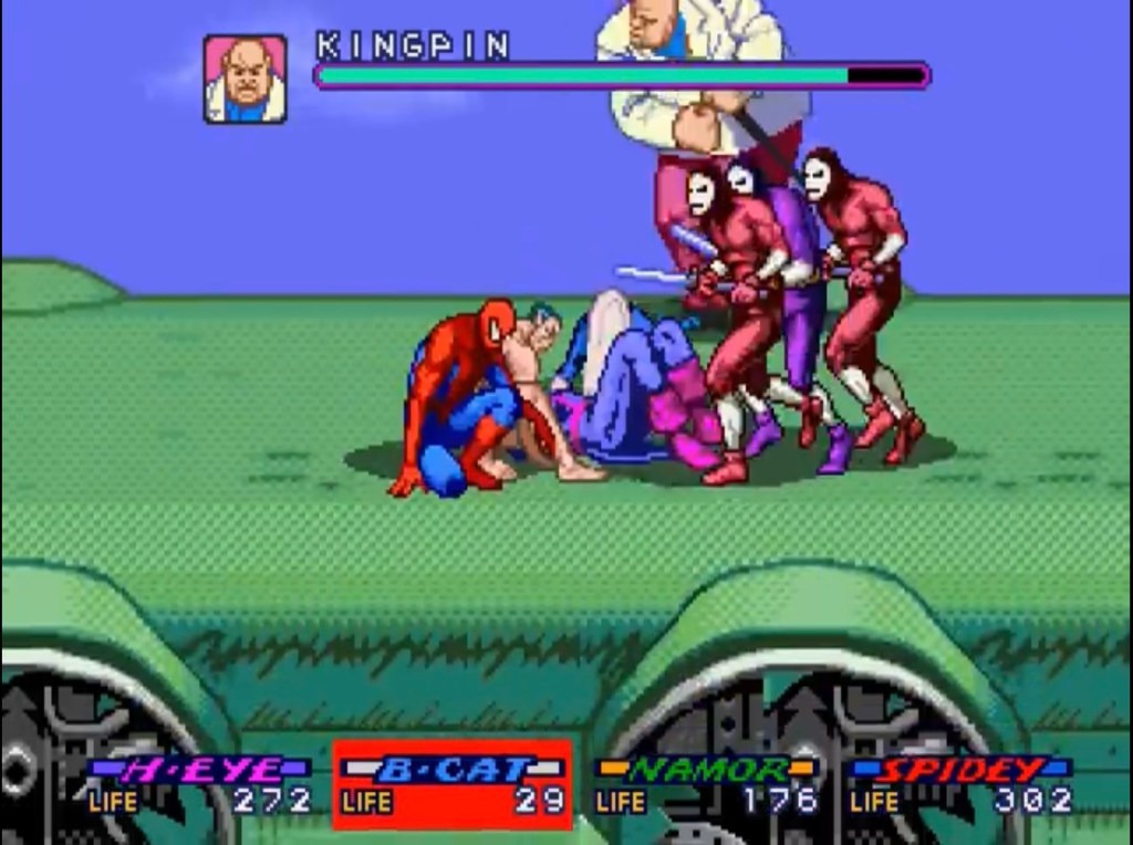 When crafting a brawler for the arcade, one of the main issues to solve initially is just what characters to make playable? The brawler had started as a one or two-player affair, but by the 90s arcade-goers expected four-player co-op play. The challenge with Spider-Man is he’s mostly a solo act, so Sega likely had to work with Marvel on finding three allies to join him. They ended up settling on the sometimes ally sometimes foe Black Cat, Sub-Mariner, and the Avenger Hawkeye. The selection of Hawkeye was somewhat interesting as he was a playable character in the Captain America brawler also released in ’91. This naturally lent to comparisons between the two titles with at least my group of friends viewing the Spider-Man Hawkeye as the far superior affair since the graphics were far more attractive.