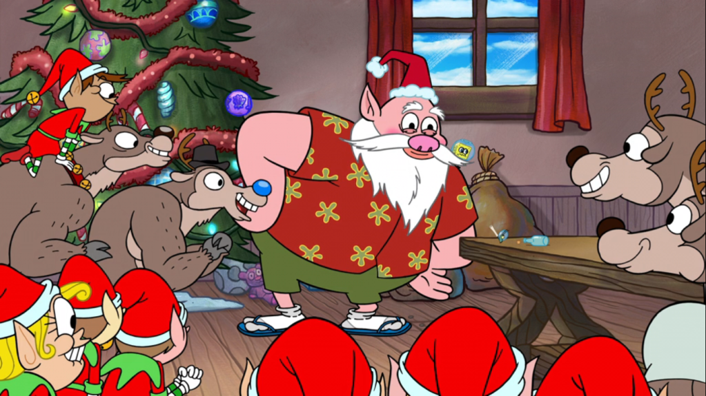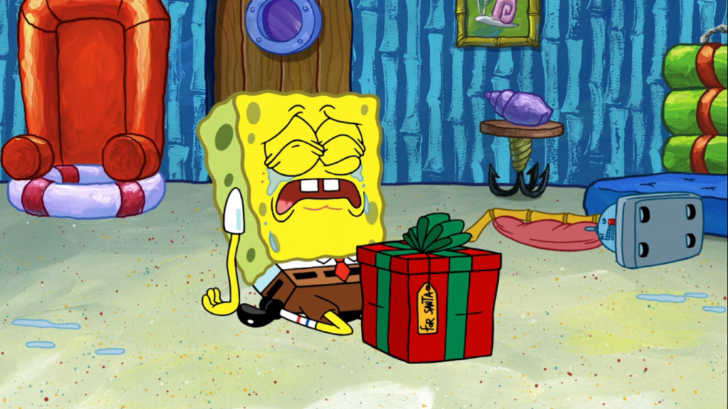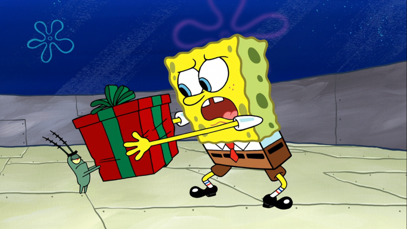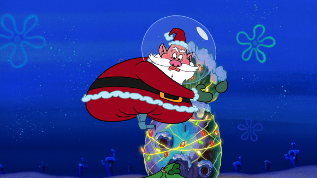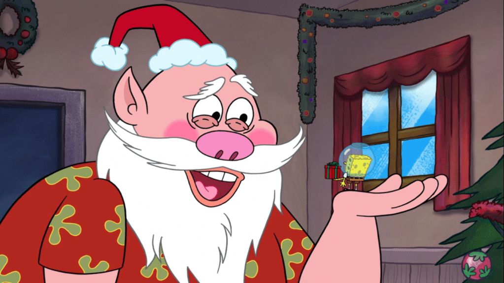 The episode begins as any other without any extra holiday fanfare. The title card is at least set to an instrumental version of “Deck the Halls.” When the episode begins, we’re shown a traditionally animated (for this era of the show) shot of Bikini Bottom decked out for the holidays. It’s somehow covered in snow or a snow-like substance, but this show has very few rules when it comes to its setting. SpongeBob (Tom Kenny) is in his aforementioned pineapple under the sea preparing for Santa’s arrival. Unlike most people, or sponges, SpongeBob actually has a present for Santa. Either he’s really generous or he’s angling for a little something extra. Either way, it’s a nice gesture that goes beyond the typical cookies and milk.