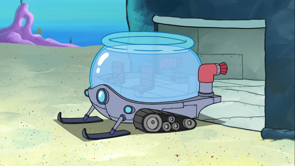 Plankton informs the two that he’s coming with which they don’t seem to mind at all. When they ask how he’d like to be shoved, Plankton smugly whips out a remote. Informing the two they’ll travel via other means, he presses a button and out from the Chum Bucket emerges a sort of fishbowl on snowmobile treads and skis. Plankton informs the pair he built it to fly and run over bodies in preparation for the zombie apocalypse. I’m guessing they needed to include the zombie apocalypse bit to please the network censors since they likely couldn’t simply depict Plankton as murderous.