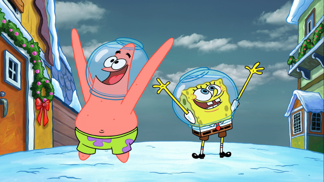 Despite the explosion, the ship seems to be fine. Well, everything except the navigation system. The boys emerge from the ship (with fishbowls full of water on their heads) to bask in the glory of the North Pole. Plankton is rightly irritated with the damage done to the ship, while Patrick and SpongeBob don’t appear to be phased one bit. As they start walking through the park, Patrick and SpongeBob are captivated by their surroundings. They’re also unable to discern a fake elf or fake reindeer from a real one. Plankton, on the other hand, has taken note of the lack of coldness and the presence of smog in the air, but SpongeBob and Patrick just declare it’s some special “snog” and continue prancing along delighted by their own ignorance while Plankton just looks defeated.