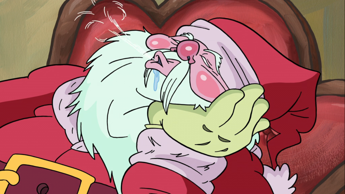 SpongeBob, along with his pet snail Gary, retire for the evening since Santa doesn’t visit homes with active residents. And soon enough, Santa (Lewis Black in what is a pretty atypical role for him) arrives! It’s a bit weird seeing him animated in a more traditional sense after only seeing him depicted in the stop-motion A SpongeBob Christmas, but his design seems to be more or less the same. He has a rather elven appearance to some of his facial features, but he also has the big, round, belly one would expect of Santa. Initially, he has a little trouble navigating SpongeBob’s home on account of the fact that he’s way too big. I guess we didn’t see this aspect of Santa back in that other special, but he actually needs to shrink himself with magic dust in order to enter the home. Once inside, he’s positively giddy as he dances and prances about SpongeBob’s living room. His jiggling, bulbous, ass knocks the present SpongeBob left out for him behind the couch without him ever noticing it. He places a gift for SpongeBob under the tree and then departs.