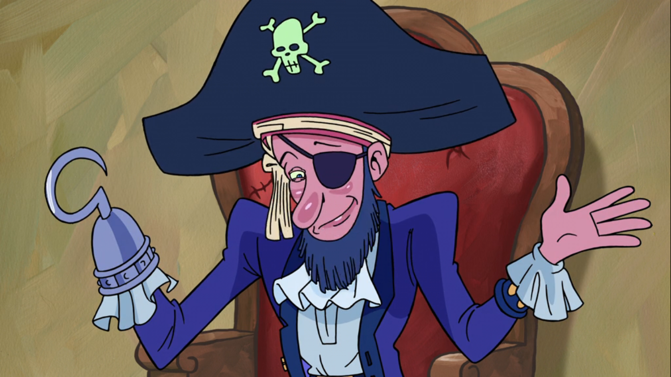 The three walk down a dilapidated red carpet (the interior of this place is not the equal of the exterior) until they finally come to him – the big man! Or, well, he is indeed a big man, but he’s also asleep and snoring loudly in a big chair. SpongeBob and Patrick run at him while Plankton can scarcely believe it. The two nitwits each jump onto one of Santa’s knees and sit with giddy anticipation for Santa to wake up. His eyes crack open a tiny bit and he asks them what they want for Christmas. SpongeBob and Patrick immediately start shouting over each other a whole bunch of unintelligible stuff as they must be among the few thinking of Christmas lists in July. Santa’s eyes then finally flutter open to see who is actually on his knee. To my surprise, he knows them by name! Is this guy the real deal after all? He also tells SpongeBob that he’s his biggest fan and SpongeBob is forced to correct him that Patchy the Pirate is actually his biggest fan. Which makes sense, because this ain’t Santa.
