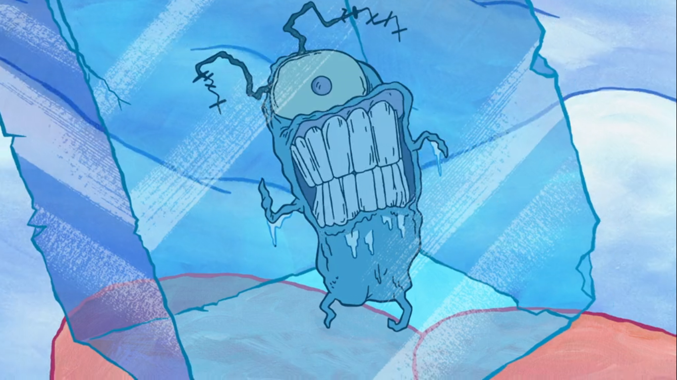 The boys set off once again and we see their adventure unfold over the map. They get off to a bad start first traveling across the U.S. all the way to Florida where they’re eaten by an alligator. They escape to Idaho, before getting diverted to Nova Scotia where an angry moose donkey-kicks them up to the North Pole. When they arrive, we see the effects of the cold as Plankton is encased in a block of ice while SpongeBob has turned blue and is shivering beside him. Patrick, who has been asleep, is also blue and wakes up to ask if they’ve arrived yet, only for his eyes to shatter. Patrick and SpongeBob then disembark from the ship to approach the real Santa’s work shop. Plankton is conspicuously absent, or not. He’s actually still in ice and SpongeBob asks Patrick if he’s enjoying his “Plankton Pop.” Patrick, who has Plankton pinned between his face and the glass of the bowl over his head, declares he can’t wait to get to the chewy center. We get a close-up of Plankton which looks rather horrifying.