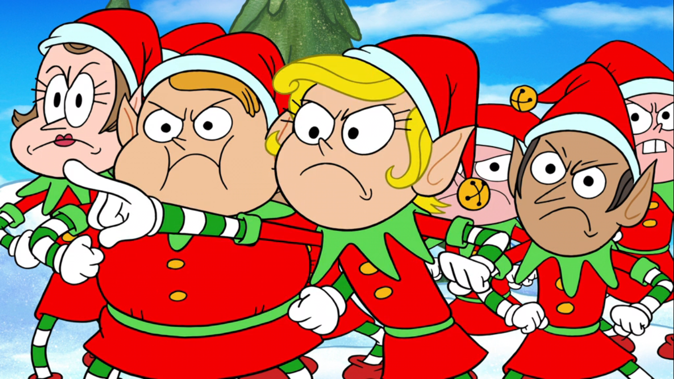 We cut to a fireplace and out from it emerges SpongeBob and Patrick. They’re in a rather cozy looking room and before them stands Santa’s Christmas tree. The two are in awe, but despite their reaction I have to say it’s a pretty conventional looking Christmas tree. All that’s left is for SpongeBob to do what he set out to and leave Santa his present, but as they approach the tree with their arms linked an alarm is triggered. The elves burst in and the girl elf from early recognizes the pair of “trick or treaters.” They think they’re hear to steal toys. They’re also too angry to listen to any sort of reason as they burst in forcing SpongeBob and Patrick to escape by climbing up the tree.