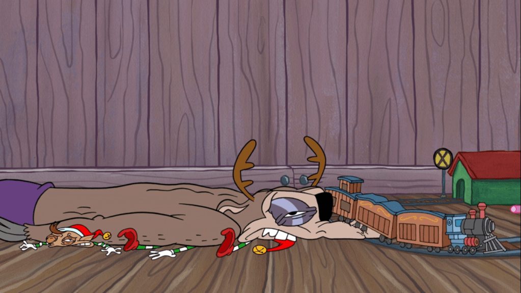 It’s at this point that Bludolph and the other reindeer storm in as they were alerted to the break-in as well. This means Plankton’s beating is over, but he gets stepped on by a reindeer for good measure. He pops up wondering if they’ve had enough and calls them a bunch of cariboobs. It’s a good insult since reindeer are indeed caribou. I guess Bludolph and company are kind of like the security up here, but they also seem to have some conflict with the elves. They feel like the reindeer are out of line for coming to their aid and there’s quite a bit of hostility between the two. When a reindeer gets mistakenly hit by a toy the elves were throwing at SpongeBob and Patrick, a brawl breaks out between elves and reindeer. Despite the reindeer being the far larger species, the elves certainly came to play and both sides take on some casualties. Though some of it is self-inflicted on the part of the reindeer. One of them, I think it’s Prancer, manages to get his antlers stuck in a ceiling fan causing him to fall on some elves. Then his snout gets run over by a train.