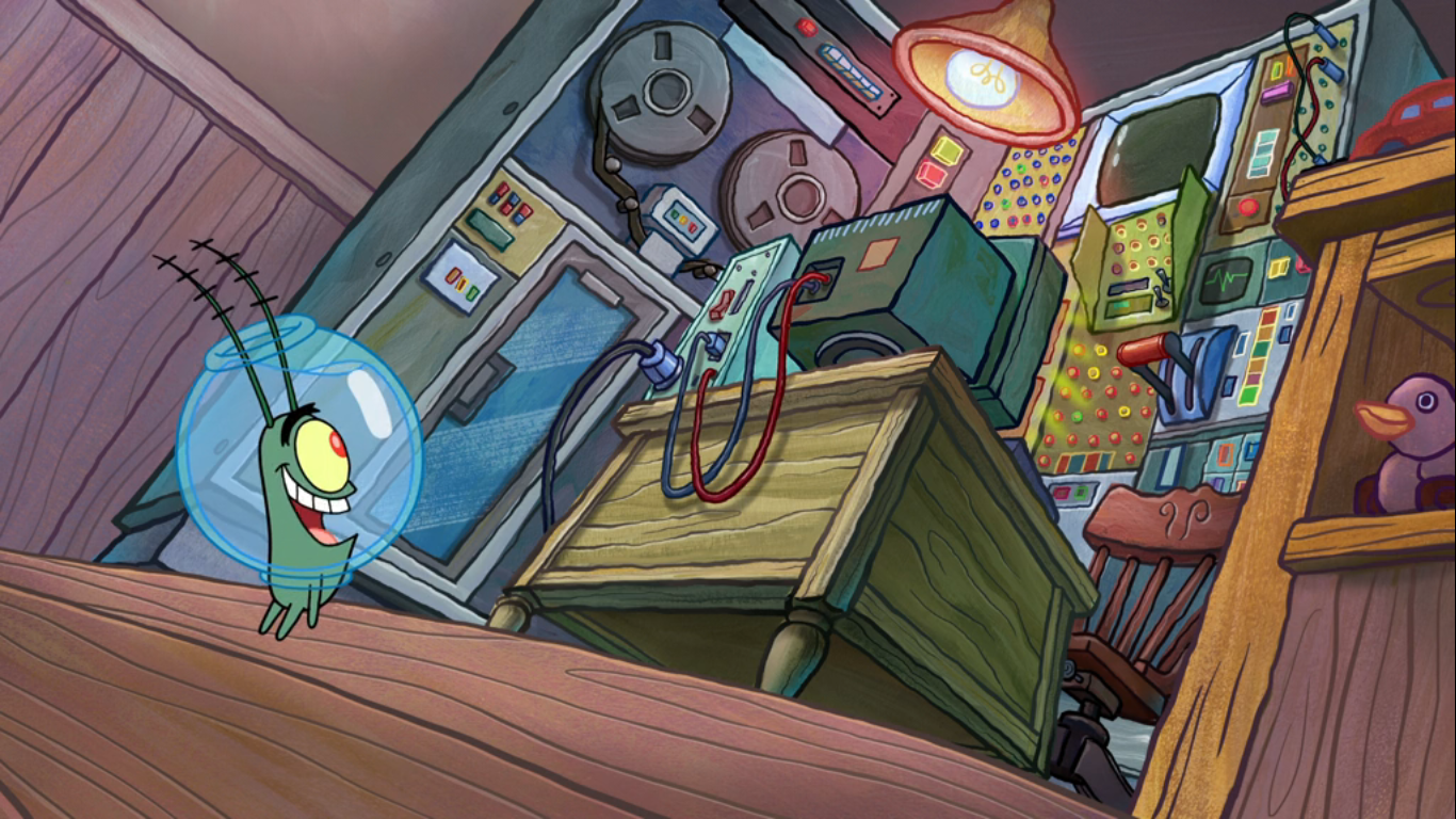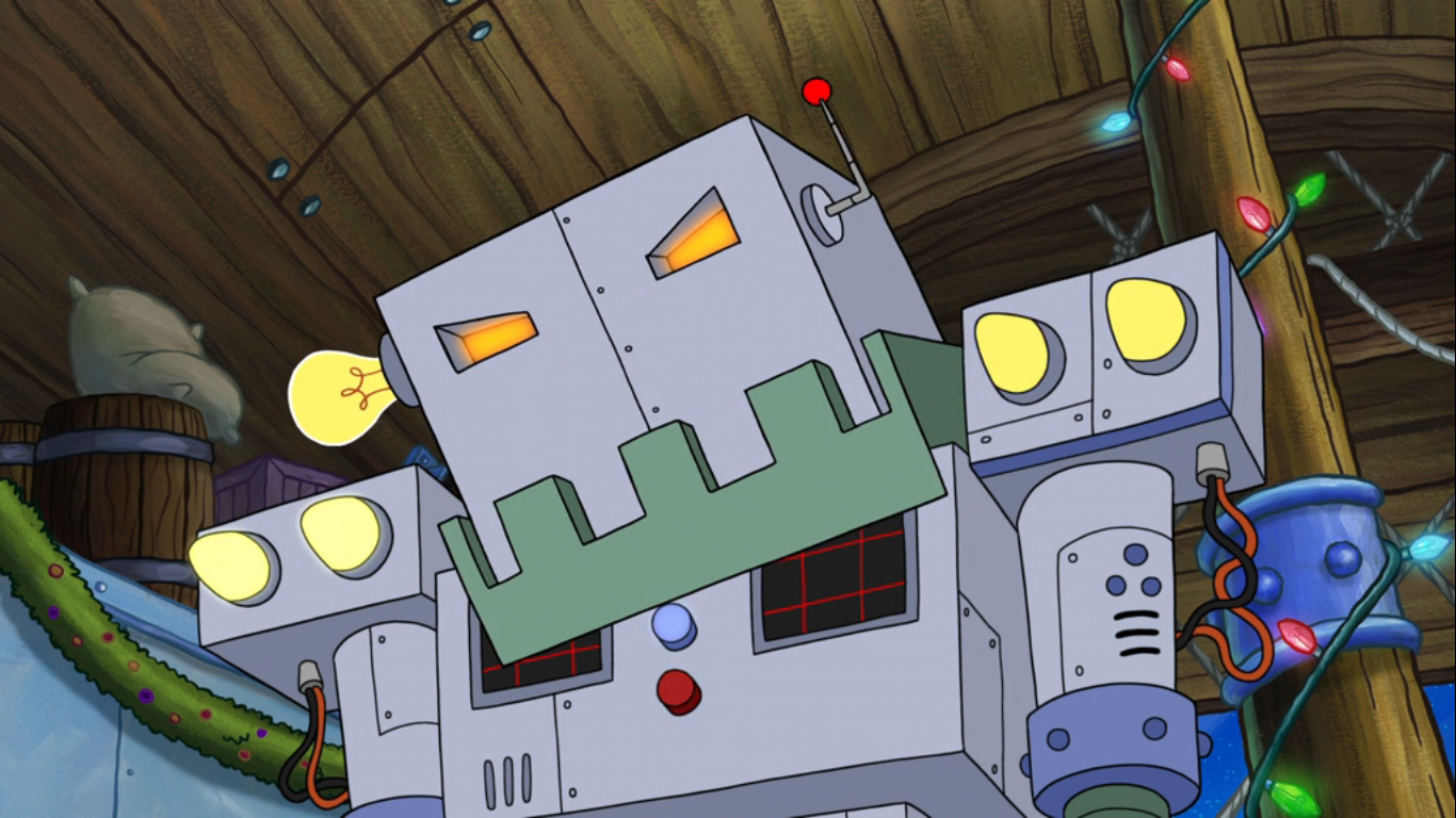 Upon reading such words of encouragement Plankton appears touched. Then his soft expression is replaced with a hardened one. One of determination and malevolence! He shovels all of that coal immediately into a giant robot which has just been standing there. The coal-powered monster belches fire and we cut to an exterior shot of the restaurant now glowing from the fire within as the sounds of screams (and Plankton’s laugher) coming from inside take us to credits.