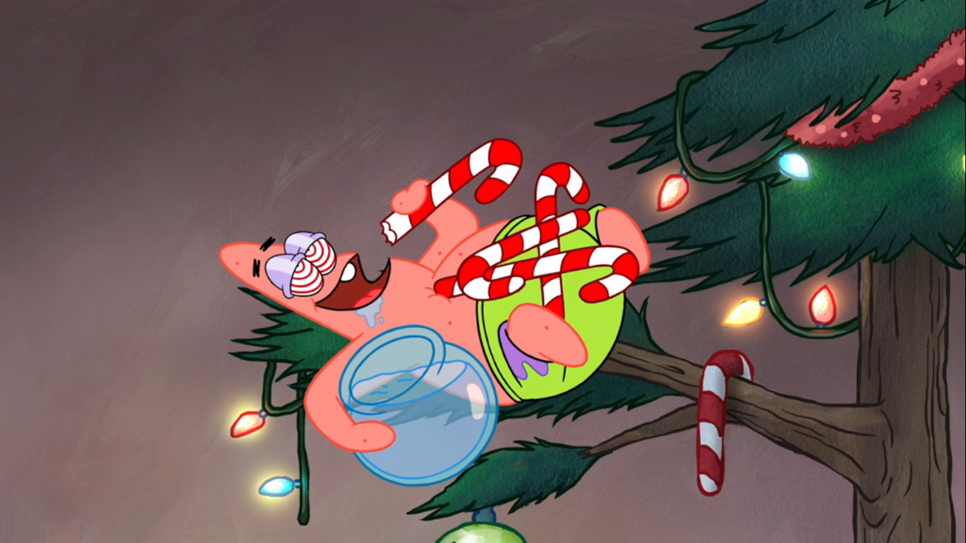 Santa thanks SpongeBob, but the little guy is always looking out for others. He makes sure to point out to Santa that he would never have made it to the North Pole without Plankton’s help. He even tosses in a “he’s not such a bad guy,” to try to sweeten the sentiment. He also credits Patrick to getting him there, which causes him to remember that Patrick is still in the tree! We pan to Patrick in the tree who has managed to get his hands (flippers?) on several candy canes. His eyes are all striped again and he just offers up a “Happy holidays to me!” I think it would have been funnier if he said happy Halloween.