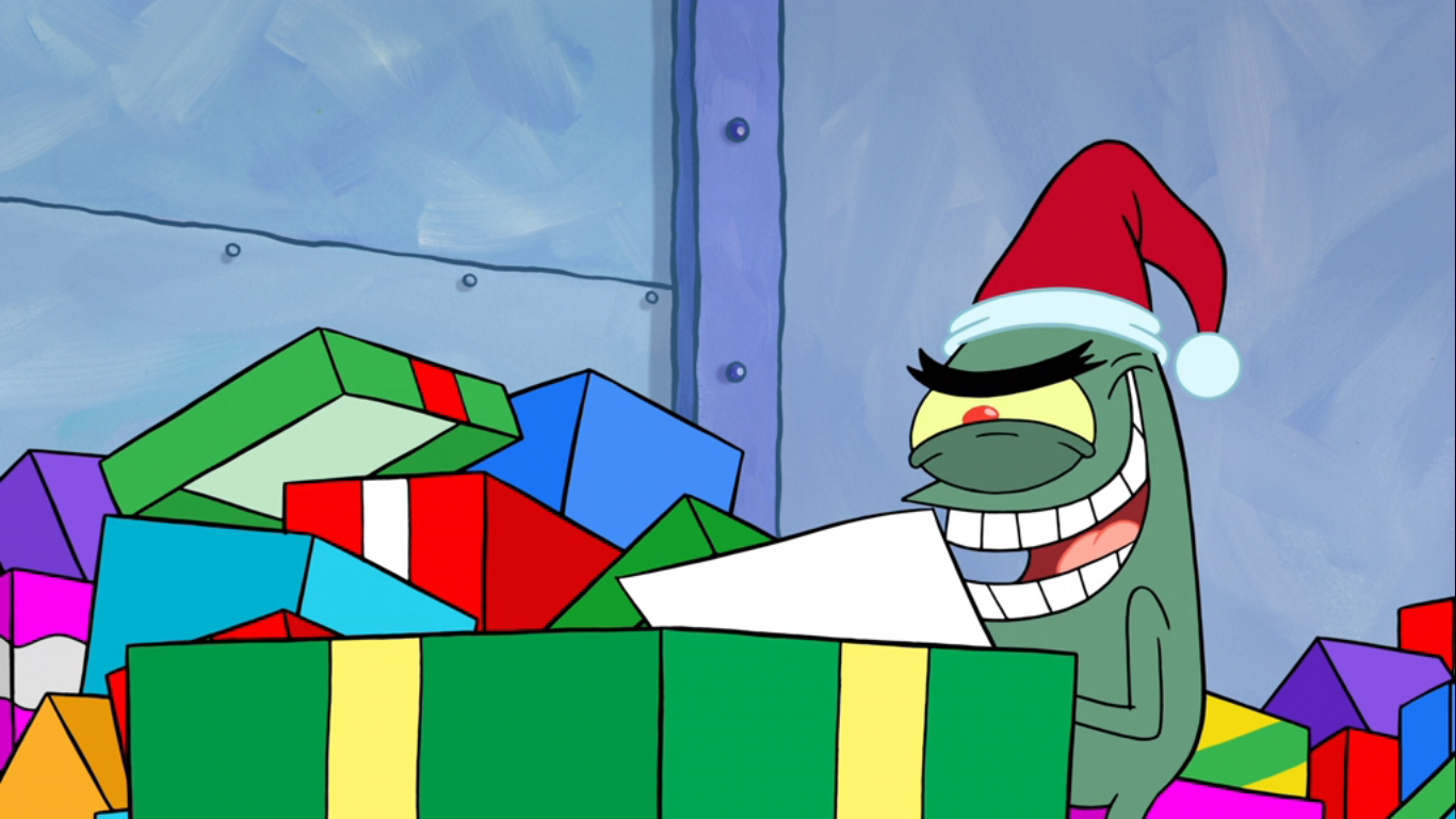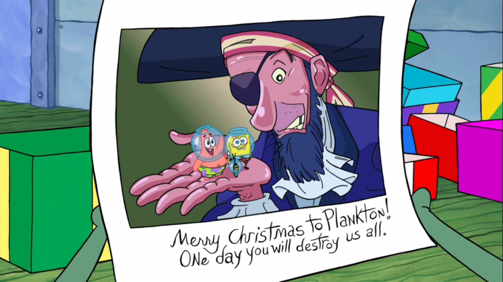 Fast forward five months and it’s a Christmas party at the famed The Krusty Krab. SpongeBob and all of his friends are enjoying the festivities as presents are being handed out. Plankton is there as well and we see him cheerlessly open another present which contains a lump of coal. He tosses it aside where it lands amongst a pile of other coal. SpongeBob then sidles on up and gives Plankton a gift as well. It’s a picture of him, Patrick, and Plankton with Patchy the Pirate from their adventure to the North Pole. It also contains a message of encouragement from SpongeBob for Plankton as it says “One day you will destroy us all!”