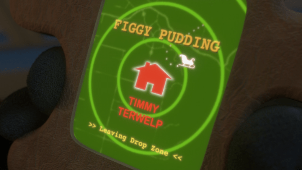 As they put Timmy in his bed, Wayne gets a call from Magee. She mentions how Wayne must have noticed how bad the storm is outside to which he responds with “Well, I am now.” She explodes on him as Wayne’s admission of not being aware of the weather means he’s not on the roof which means the house isn’t prepped. He tells her they had a coal in the stocking, but assures her everything is fine because they’re putting him to bed. Everything is not fine as Magee radios to Eight Maids a-Milking which is the call sign for the reindeer. Dasher (Nathan Greno), acknowledges that he hates that call sign before taking Magee’s call. He and Dancer (David DeLuise), who is basically freaking out, report back that they have no visibility and things look bad. Magee has no choice but to radio the Big Guy and inform him the house isn’t prepped and suggest they do the unthinkable – Figgy Pudding. Santa indicates it’s never come to this before, but Magee reminds him it’s one house, one kid, and he’s needed at many more. He reluctantly agrees and the command is given to skip Timmy’s house.