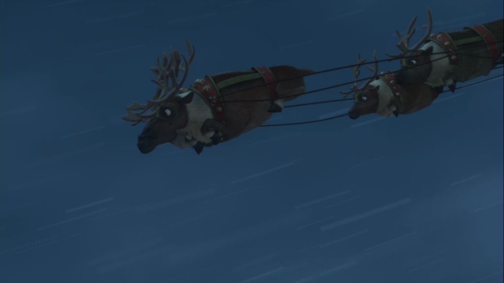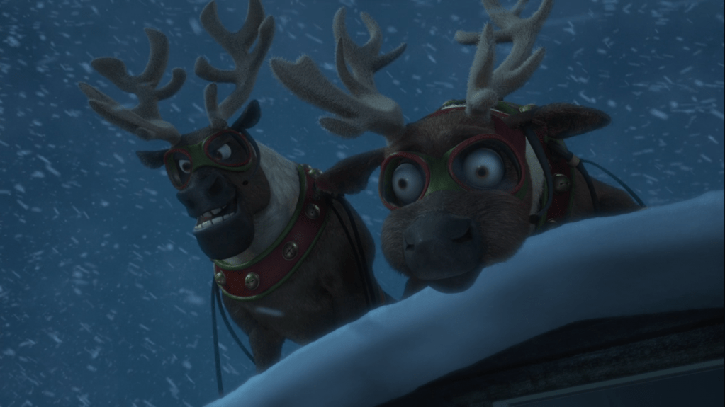 Magee tells them they need to get a move-on as Thrasher is the last transport waiting. This excites Lanny even more as they head for two big, steel, doors that soon open into a hangar. Thrasher (Hayes MacArthur) is a massive reindeer with gray fur and dark sunglasses. He’s got attitude to spare. Lanny approaches him from the front and remarks that he thought Thrasher was just a myth. He’s then told by the reindeer that he is a myth and that if he tells anyone about him then Lanny will be the one that doesn’t exist. He emphasizes this by turning the candy cane he was sucking on vertical in between his teeth and crushes it.