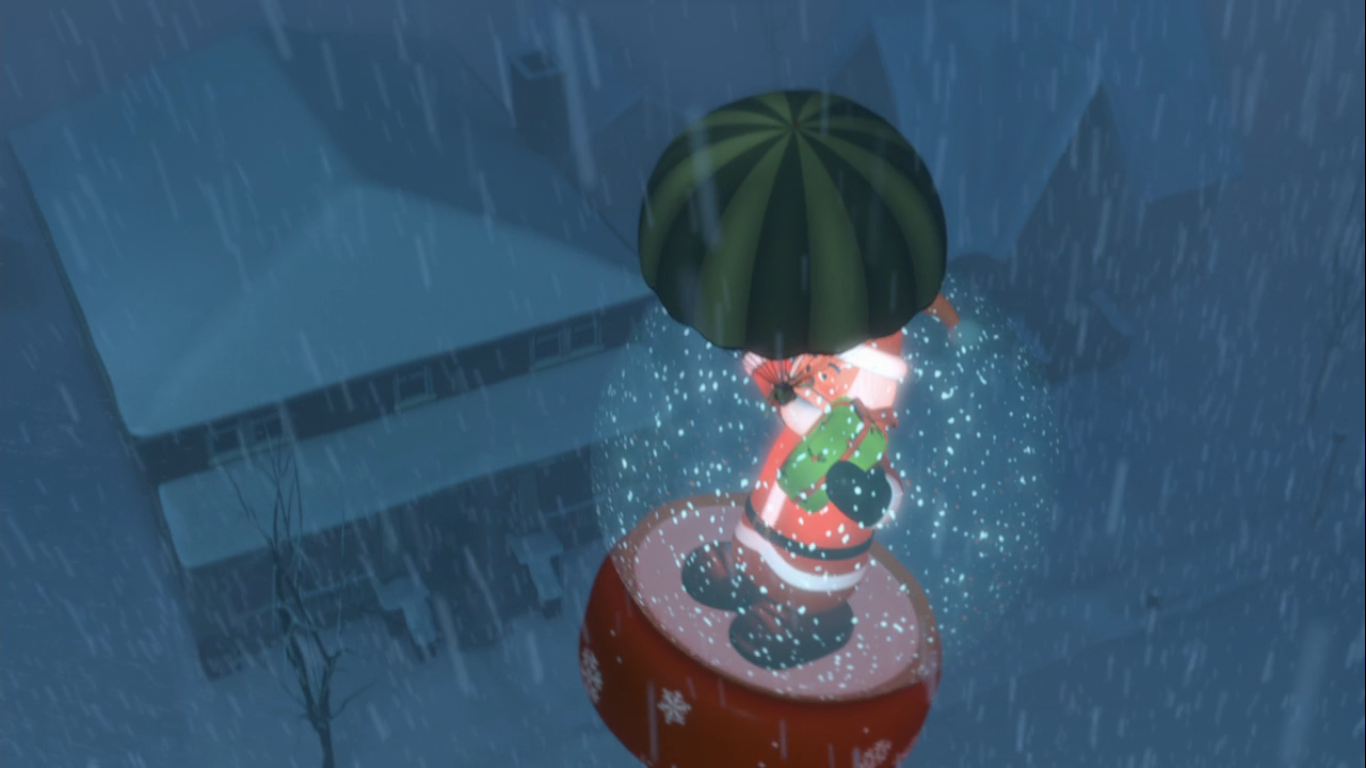 The pair make for the neighbor’s house as fast as they can go skiing across the rooftops. Wayne zeroes in on a giant, inflatable, Santa Claus in a snow globe while instructing Lanny to gather some rope. Wayne fastens his gingerbread man to the globe and tapes his hat over it. When he turns around, Lanny is there with basically every Christmas light from the house and asks “Is this enough rope?” Wayne is both surprised and impressed and the two head back to Timmy’s house with their Santa globe and “rope.” Lanny is able to plug the lights in by the mailbox while Wayne inflates the Santa with his stocking stuffer gun. He deploys the parachute on his hat and the wind pulls the inflatable high into the sky with the lights trailing behind it.