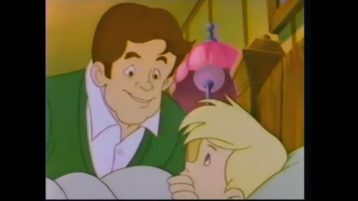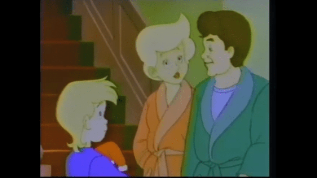 This leads into a brief musical number about the Pillow People that is just another commercial. It’s horrible, but it is the only place where my boy Punky is featured. Plus it contains the most ambitious animation we’re going to see with these wild tracking shots. This is too good for Pillow People. When the song is over we find an inspector pillow guy who speaks with a French accent snooping about. He’s clearly based on Inspector Clouseau. Nearby is Mr. Sandman Pillow sleeping on the curb who Sweet Dreams is eager to point out. Then a Dr. Z goes skating by with something called 40 Winks. There are these little pillow guys bounding after him and I don’t know if 40 Winks refers to one or all of them. Either way, he’s the typical professor character who probably has all of the good ideas that advance the plot or something. Or he would if this became a series (it did not). There’s a bell ringing in his laboratory or something and apparently he knows right away that it’s Santa Claus. Billy is rightly surprised to hear that the real Santa would be in Pillow Valley, but Sweet Dreams just replies matter-of-factly with an “Of course,” when he asks if it’s really him. She’s so smug.