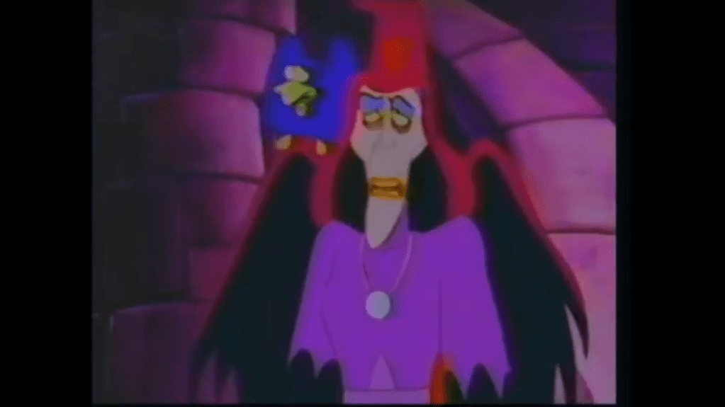 In a sinister looking castle with a giant dragon’s maw for an opening, we find the Noises in the Night apparently enjoying the gifts their master stole. We then get our first look at this Nightmara as she descends a staircase with what appears to be a raven on her shoulder. She’s…unimpressive. She has a visage like Mother Brain from the Captain N show and a body like Venger from the Dungeons & Dragons cartoon, only it’s purple instead of red. Maybe they date? She has either a cape or bat wings and she’s just all together some creepy old lady. Not really scary or imposing, though certainly ugly. She’s pissed at her minions for playing with the toys and making a bunch of noise, but making noise is essentially all that they do.