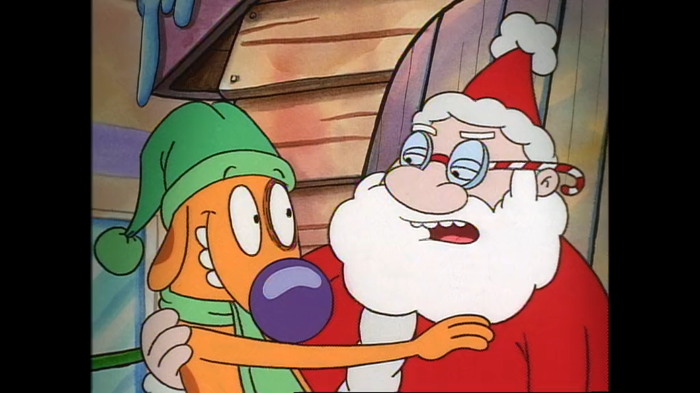 Outside a massive, stone, mansion rests a rather cruel and inelegant looking Santa robot. It’s a decoration for Rancid’s home and everything has a very cold presence. The limo pulls up carrying the crew, but only Rancid and Rancine emerge. Rancid has a large, wrapped, box in his arms and once he enters the mansion he chucks it towards a giant tree. As it hits the floor we hear CatDog groaning in pain from inside. The gift comes to rest at the base of the tree as Dog remarks there’s only a few more hours until Christmas and access to all of Rancid’s stuff! Cat is just as giddy and remarks that this is an idea with absolutely no downside. We then cut back to the mall to find Santa seated on the stairs outside looking downright miserable. Mrs. Claus (Bamford) is there beside him trying to ease his mind, but he can’t get over what he saw. CatDog sold itself to Rancid as a Christmas present! That would seemingly make CatDog a prostitute in the eyes of Santa and he just can’t get over that. Meanwhile, that even speaking elf is just flabbergasted that this Santa is the real deal. He asks if that means the Easter Bunny is real too and Santa remarks “He better be, he owes me sixty bucks!”
