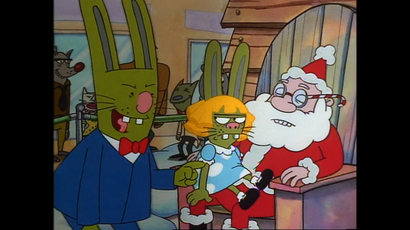Santa has no reaction to Cat’s selfish want and Cat doesn’t seem to be at all interested in getting his approval anyway. The two depart, but a call to “Make way,” is soon heard. It’s coming from the mall owner, Rancid (West), who is a big, ugly, green, rabbit that looks like some sort of cross-over between an Arthur character and something from Life in Hell. He wants everyone to move out of the way so that his niece, Rancine (Maria Bamford) can tell Santa what she wants. She’s about as ugly as him, just smaller and in a dress, and she does not look happy. Santa goes through the whole routine with a look on his face that suggests he knows that this kid isn’t going to ask for something selfless. She at first can’t even think of anything since her rich uncle buys her whatever she wants, but then she lays eyes on CatDog.
