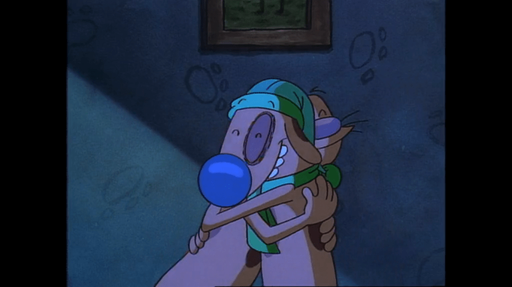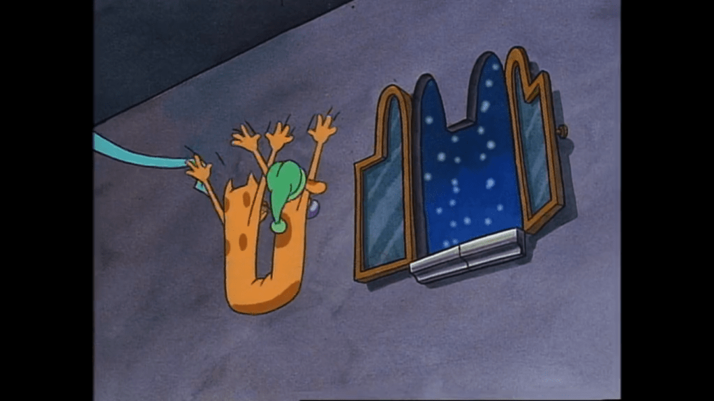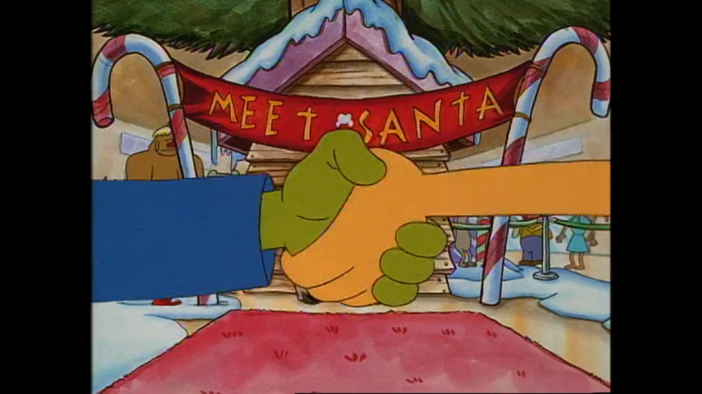 Is this episode CatDog good? I don’t know. I felt pretty indifferent about CatDog when I was younger and the show was just starting and I suppose I still feel that way. I get the whole point of the show and the whole opposites attract kind of thing makes sense conceptually, but I mostly felt nothing. Maybe that would come from watching more episodes? Cat seems like he’s mostly intended to be unlikable while Dog is cheerful and sweet. He’s almost too cheerful and sweet here as he’s oblivious to how shitty a friend Cat is to him. I don’t worry about them getting beat up, I’m not begging them to not sell themselves for Christmas, and I’m not really invested in their Christmas experience. I kind of wish the episode went all-in on its messaging and just ended it on the group hug. They didn’t need stuff, so why bring the stuff back? Maybe just cut to Santa flying overhead and looking on with an approving smile? The final visual of CatDog pulling the sleigh was fun, but the special didn’t need it either.