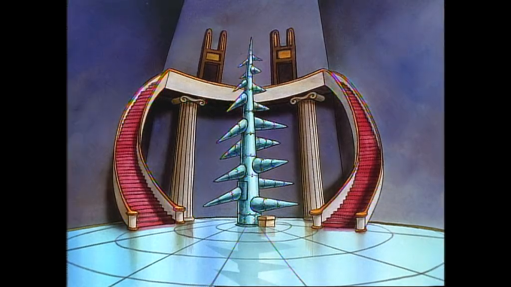 Dog was Santa’s only hope for Christmas spirit in this world, but now that belief has been shattered. Santa feels that he has no other choice: he has to cancel Christmas. The world is no longer deserving, and as Santa flies off in his sleigh with four reindeer (he’s a fake!), Christmas basically just disappears. Lights, decorations, trees, all vanish before our eyes. The giant tree in Rancid’s mansion? Stripped of even its fake pine needles leaving behind a cold, monstrous, spiked, metal contraption. All of the gifts beneath it have vanished, all except the one containing CatDog. It’s been stripped of its festive color, but at least they weren’t wiped from existence too like all of the other stuff.