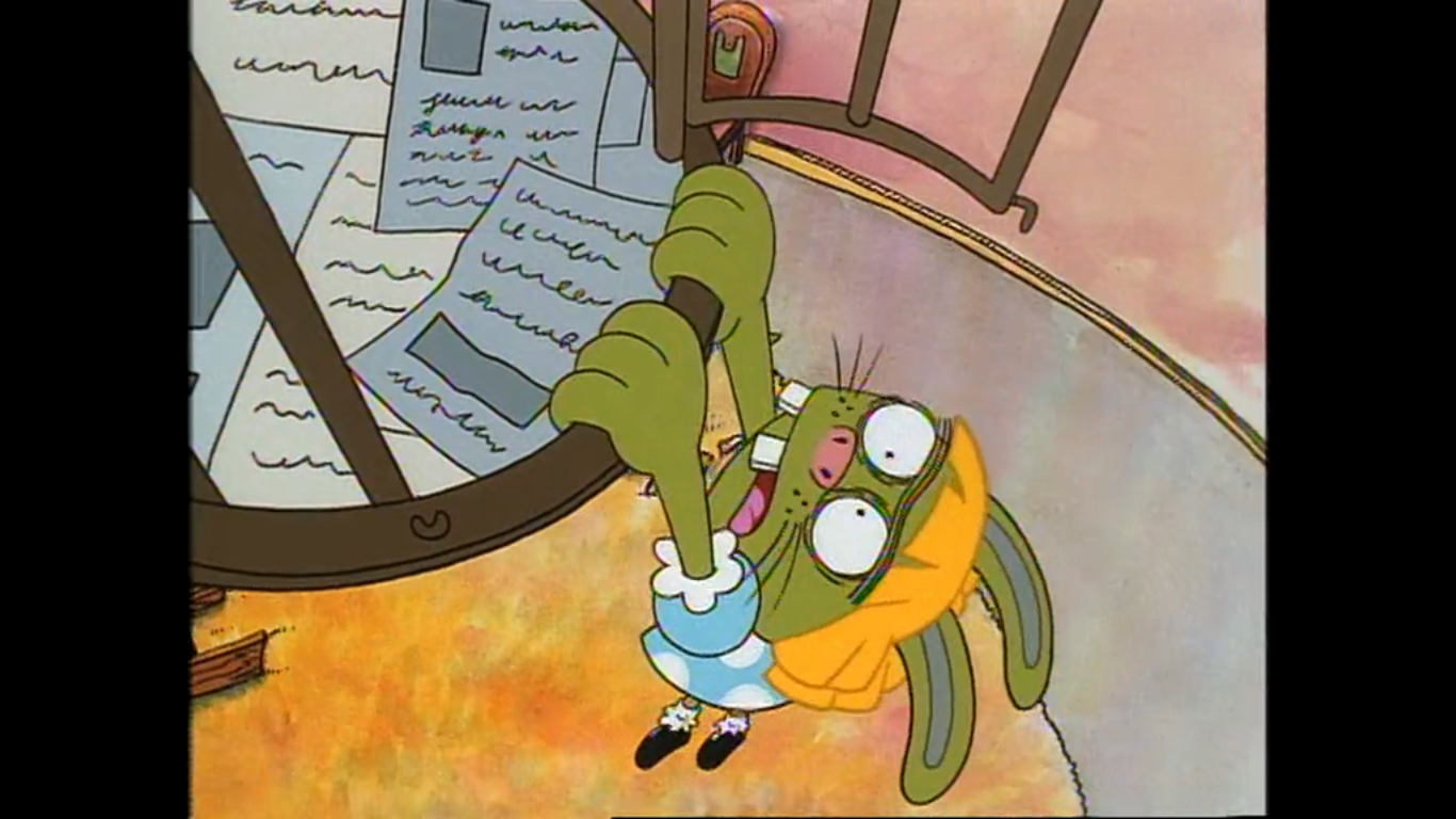CatDog now must escape the mansion, but to do so they need to avoid Rancid. As they creep through the halls they spy the rabbit coming their way. He has his head buried in some paper though and could hardly be bothered as he walks by. They pretend to be one of his many statues anyway and in the process reveal that they can change color like a chameleon. Was this done for comedic effect or is this something they do often? Regardless, with Rancid avoided the pair make their way back to the main living room with the big, metal, tree. There’s a window high up on the wall and Cat takes over to climb the tree to the top. The window is still a ways away, but there’s a chandelier above them and Cat still has his scarf. He twirls it over his head like a lasso and successfully ropes the chandelier. The duo swing for the window…and slam into the wall. He missed, and CatDog falls to the floor, but worry not! The front door is unlocked, so that was a lot easier than expected. Too bad about the pain and misery that was all for nothing.