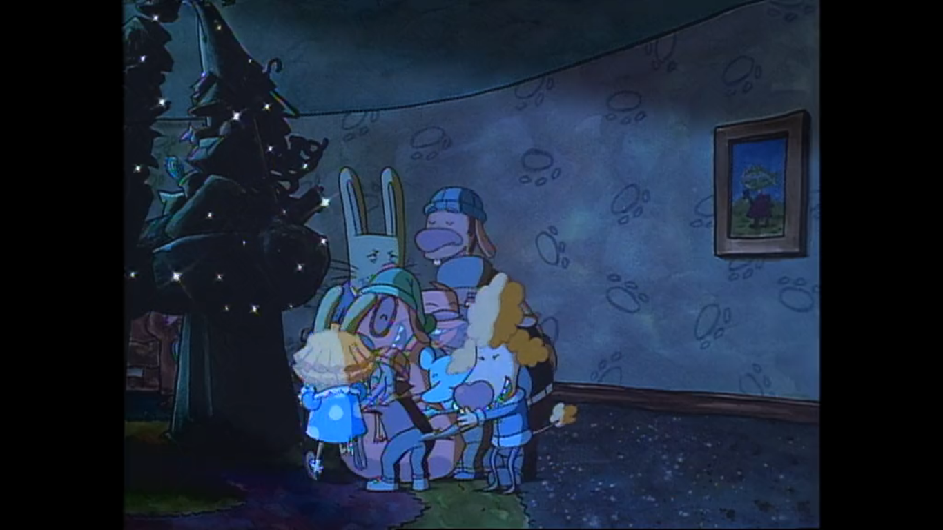 Santa comes in and a more natural light does with him. We were in kind of a cool blue and black environment, but now it’s positively bright. Cat immediately goes to Santa to apologize for what he did. Santa counters that he should apologize to CatDog, even though what they did was among the most vile acts imaginable. He’s really laying it on thick. He definitely equates this whole thing with prostitution. Imagine the naughty stuff Santa must see and he found that to be the most vile? Maybe this world is just way cleaner than I could imagine? Dog accepts Santa’s apology and Christmas is back on, baby! All of the stuff returns and Cat and Dog are each left holding presents from each other. Or Santa. I don’t know anymore.
