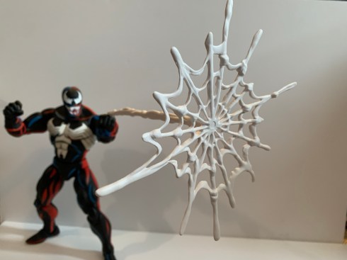 There is one other thing to talk about and it’s Venom’s web swing. If you have the Mondo Venom, he comes with a left hand accessory that’s a web swing/harness for Spider-Man. It’s based on a scene straight out of the episode “Venom” where Venom webs up Spider-Man and takes his mask off. He dangles him off a rooftop threatening to expose his secret identity to the world. The accessory is basically a belt and two loops for each hand. I was able to slide it onto my Spider-Man figure starting at his feet. It wasn’t easy and his right leg popped off in the process, but it is doable. The two strands for his hands are simple enough to attach and I plugged the Venom hand portion into my figure to test it out. To my surprise, the thing actually works! I first just had him on a surface and Venom was able to remain standing while holding Peter, but Peter’s feet were on the same surface. I moved the pair to a shelf where I was able to dangle Peter off the edge like in the show. Venom was up to the task and the two remained without issue. I don’t know if I actually have the guts to leave them there permanently like that, but I was sorely tempted. I didn’t think it had a chance of working this well, but credit to Venom’s tight joints and hefty weight. The only disappointment is Peter’s stupid, smiling, face. He really needs an angry expression or a scared one to sell this display. The black costume version of the figure comes with an angry unmasked head which probably would work better for this specific display, but that was a limited edition and has long since been sold out.