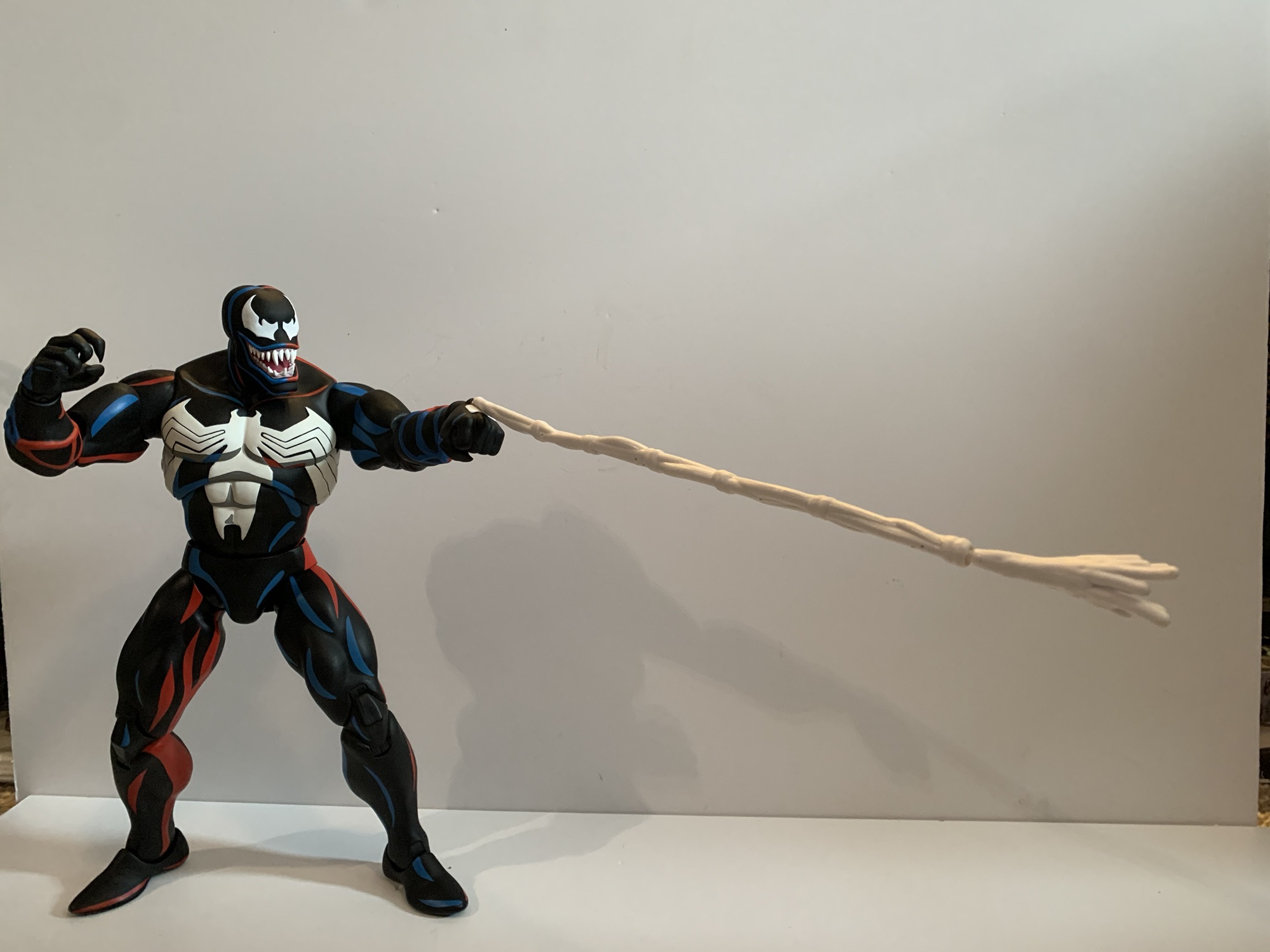 There is one other thing to talk about and it’s Venom’s web swing. If you have the Mondo Venom, he comes with a left hand accessory that’s a web swing/harness for Spider-Man. It’s based on a scene straight out of the episode “Venom” where Venom webs up Spider-Man and takes his mask off. He dangles him off a rooftop threatening to expose his secret identity to the world. The accessory is basically a belt and two loops for each hand. I was able to slide it onto my Spider-Man figure starting at his feet. It wasn’t easy and his right leg popped off in the process, but it is doable. The two strands for his hands are simple enough to attach and I plugged the Venom hand portion into my figure to test it out. To my surprise, the thing actually works! I first just had him on a surface and Venom was able to remain standing while holding Peter, but Peter’s feet were on the same surface. I moved the pair to a shelf where I was able to dangle Peter off the edge like in the show. Venom was up to the task and the two remained without issue. I don’t know if I actually have the guts to leave them there permanently like that, but I was sorely tempted. I didn’t think it had a chance of working this well, but credit to Venom’s tight joints and hefty weight. The only disappointment is Peter’s stupid, smiling, face. He really needs an angry expression or a scared one to sell this display. The black costume version of the figure comes with an angry unmasked head which probably would work better for this specific display, but that was a limited edition and has long since been sold out.