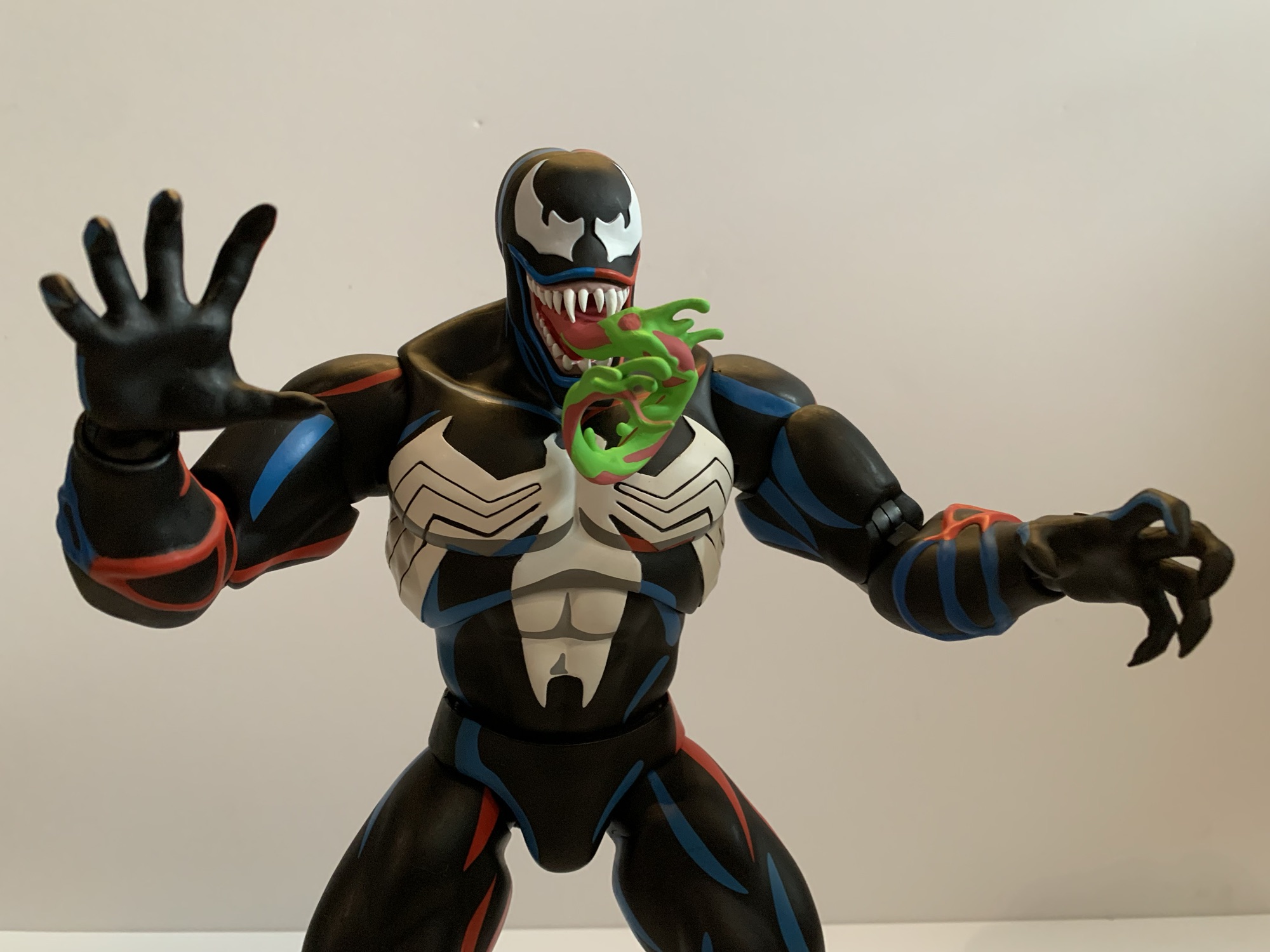 Spider-Man stands at about 11.75″ to the top of his head. I’m a little surprised they didn’t make him the full 12″, but I also don’t mind him being that much shorter than Venom. I tried to find some turn-around art from the show’s production for comparison, but the Internet has let me down. I can only compare him to still frames from the show and I have to say I feel like the silhouette is a touch off. Spider-Man in the 1994 cartoon is a pretty big Spider-Man. Pretty much all of the super hero shows back then had one style for all of the male characters. Flash Thompson would pick on Peter Parker for being a nerd, even though Pete was built like a linebacker. Here, the neck is a little slender and sits inside the silhouette of the head, which isn’t really how he was drawn. The shape of the head is also a little narrow which just draws even more attention to it. It was a Saban production and those were notoriously cheap for the time so there’s a lot of inconsistency from episode to episode, scene to scene, and shot to shot. Did Spider-Man look close to this in some shots? Probably, and there’s going to be some subjectivity on the part of the sculptor. For me personally I would have liked a slightly more beefy Spider-Man since that’s what stands out to me about the ’94 design.